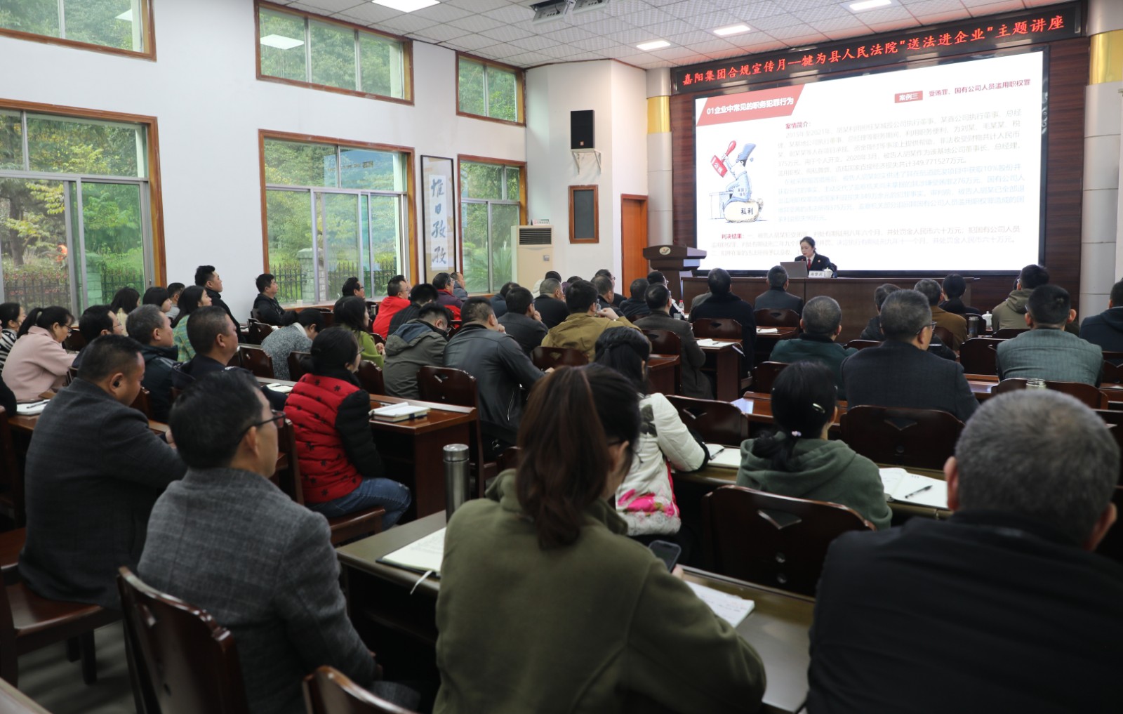 为落实省国资委“送法进企业”和川投集团“合规管理月”安排部署,进一步强化职工纪律意识、规矩意识,筑牢拒腐防变“防火墙”,营造企业廉洁从业、风清气正的良好氛围。11月30日,集团公司联合犍为县人民法院开展“送法进企业”《坚守法律底线 远离职务犯罪》专题讲座。