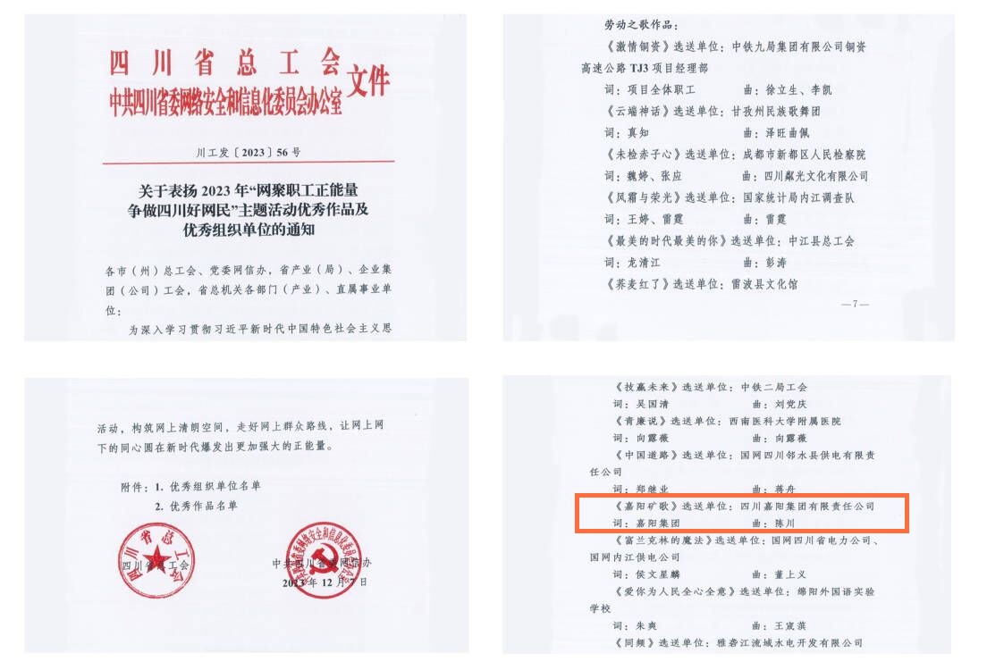 近日,四川省总工会下发《关于表扬2023年“网聚职工正能量争做四川好网民”主题活动优秀作品及优秀组织单位的通知》,由嘉阳集团报送的视频《嘉阳矿歌》获劳动之歌作品奖。