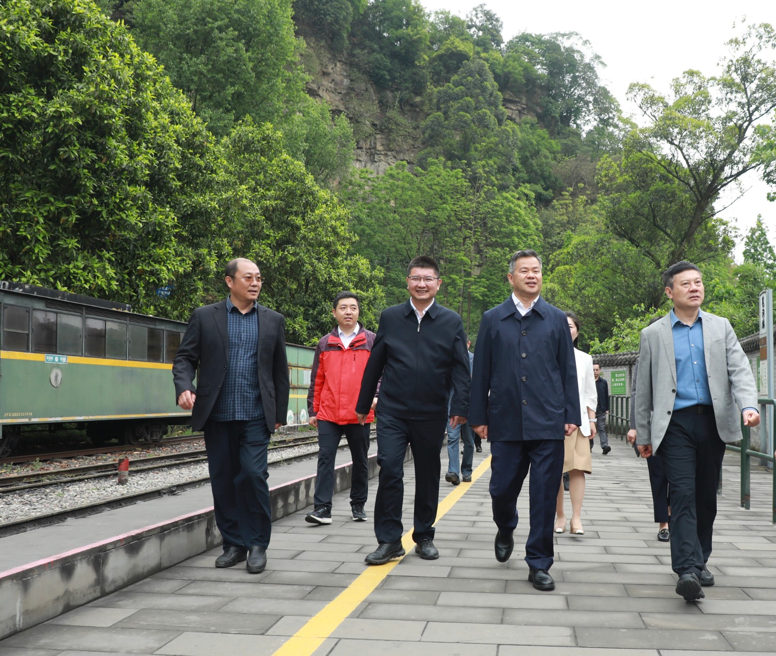 4 月 24 日,民革中央副主席、省政协副主席、民革四川省委会主委欧阳泽华率队来到芭蕉沟,深入调研嘉阳文旅融合及全国民革党员教育基地建设等情况。集团公司党委副书记、总经理范勤英全程陪同。