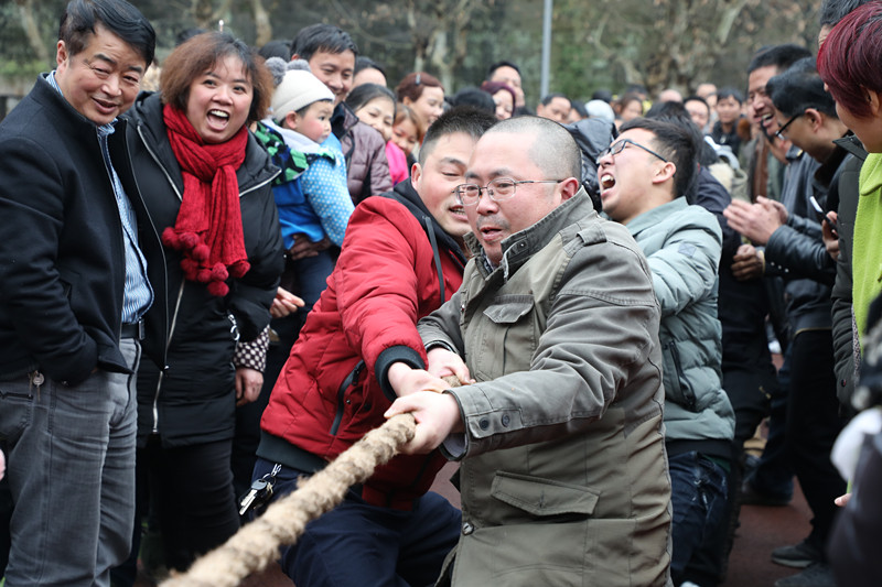 这边的文艺演出就快接近尾声另一边的职工拔河比赛又开始了。22支队伍依次上阵,两两对抗。裁判哨声一响参赛队员们各个全神贯注,身子下蹲蹬起八字脚,憋足了劲拼命往后拉,“加油、加油!”号子声、呐喊助威声此起彼伏,势均力敌的两队之间较量尤为精彩,悬殊较大的两个队对抗也能让人捕捉到笑点,拔河现场是里三层外三层围满了观众,可谓是观赏性、参与性最高的项目。整个闹元宵活动在热烈、喜庆的氛围中完美收场。