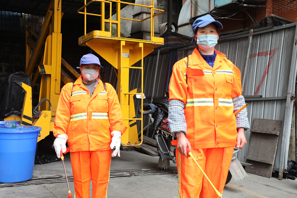 腐蚀性强,虽然班前学习了消毒药水的使用方法和注意事项,但毕竟是第一次操作,邓容全副武装后为方便,一个人徒手小心谨慎倒消毒水,在收回容器的一瞬,她的左手拇指还是被一小滴药水沾上了,“哇呀!”“快用水”“一定要小心”好在她火速在清水中稀释只是灼伤点皮!危险信号引起了大家的高度重视,新进环卫班的8名女工尽管轮流抗“疫”,从第一天开始不断互相鼓励、互相提醒、互相帮助,她们的言行为整个环卫班注入了一股暖流!