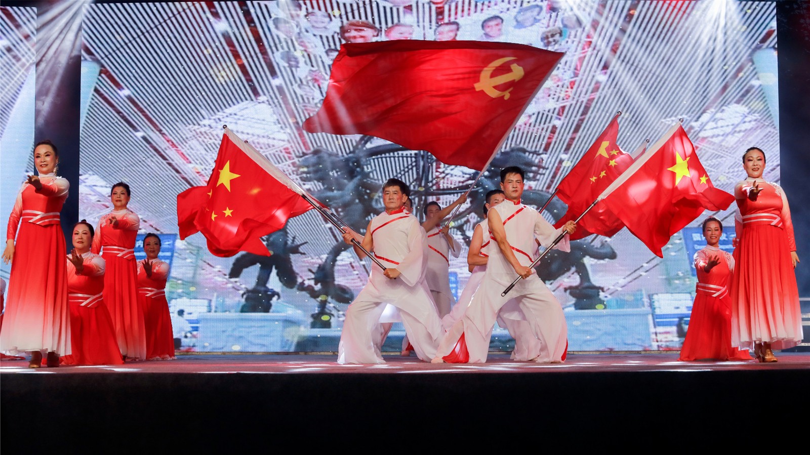 晚会在红歌大联唱中拉开帷幕,观众们随着节奏挥舞着手中的小红旗、荧光棒,整个体育场汇聚成了一片闪耀的红色星海。舞蹈《再唱山歌给党听》《领航中国》、合唱《红旗飘飘》《跟着共产党走》、三句半《小芭蕉说党史》、乐器合奏《盛世国乐》等16个精彩节目轮番上演,为现场观众带来一场视觉盛宴和精神洗礼。诗朗诵《生命之花》深情并茂地讴歌了中国共产党百年风雨历程中的英雄、先锋以及他们的献身精神,赢得了观众阵阵掌声。一首激越高昂的女声独唱《我和我的祖国》表达了对祖国的诚挚祝愿和对美好生活的无限期盼。大灾面前有大爱,舞蹈《激流勇进》再现嘉阳志愿者团结一心、众志成城抗洪救灾,为犍为“8.18”灾后重建贡献嘉阳力量的动人场景。新时代征程无限光明,强国使命催人奋进,舞蹈《燃烧吧,嘉阳》将煤矿“燃烧精神”展现的淋漓尽致,焕发出独特的时代魅力,传承红色基因,坚定理想信念,凝聚奋进力量,激励嘉阳儿女砥砺前行再出发。