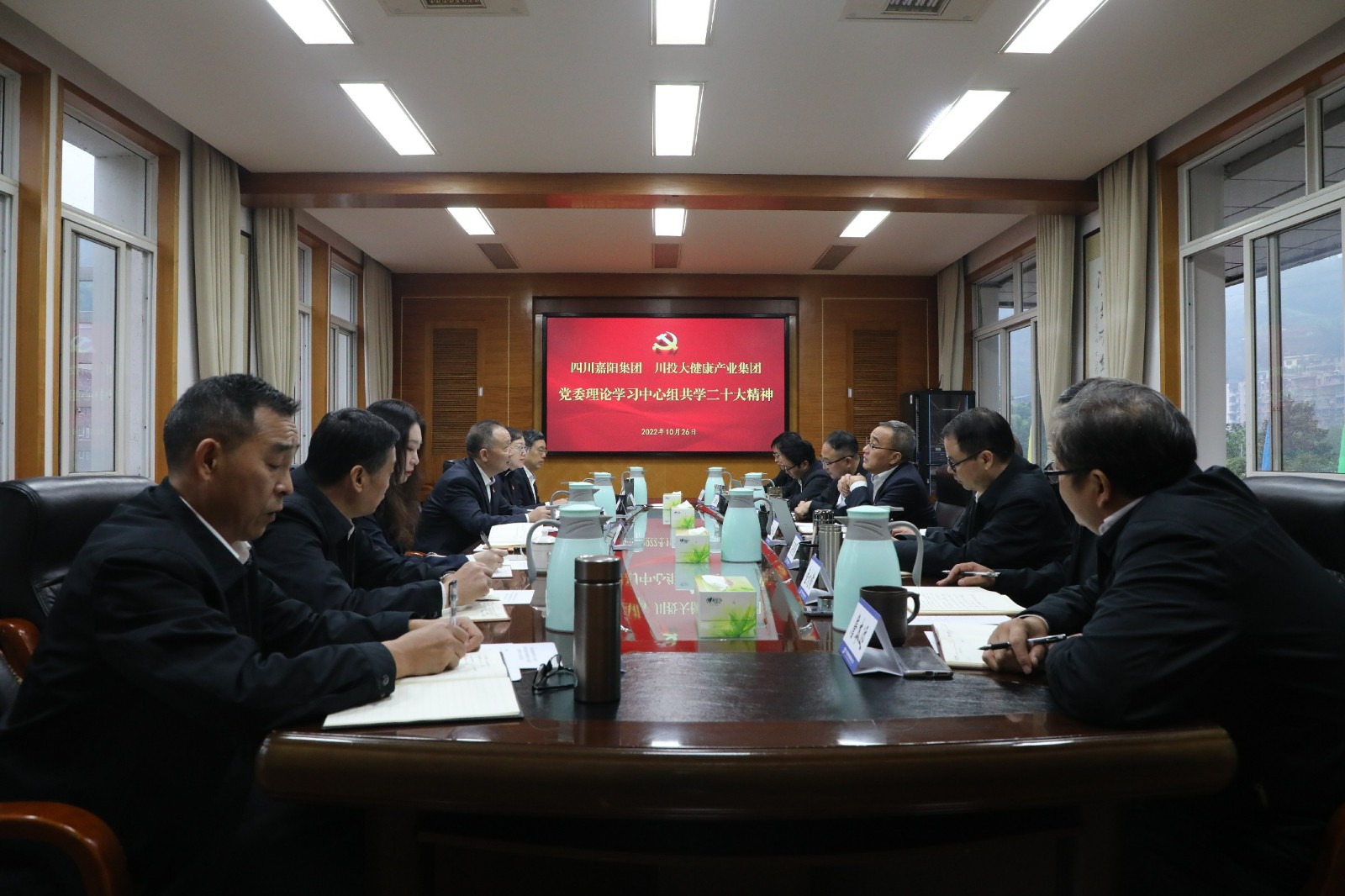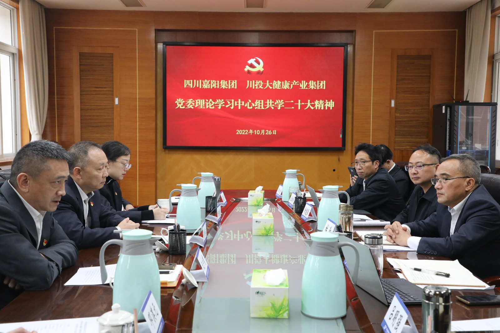 10月26日,为认真落实党建结对联建工作,嘉阳集团党委与川投大健康产业集团党委召开中心组专题学习会,共同学习党的二十大报告,深入理解二十大精神,交流学习体会。