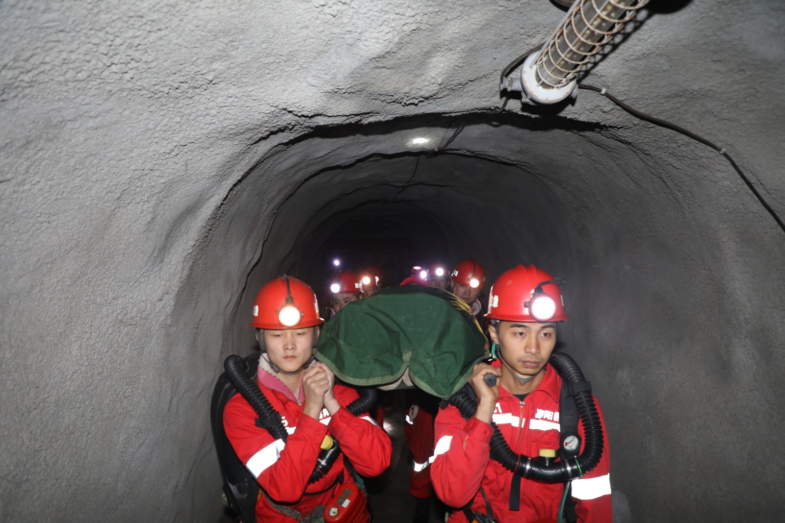 11日早上8点50分,嘉阳矿山救护队接到报警:黄村井因地震造成部分巷道垮塌,有遇险人员被困!值班员立即拉响警报,在不到一分钟的时间里,队员们迅速完成集结,携带装备火速赶往事故地点。9点15分,救援队伍到达事故地点后,一边向事故方了解矿井事故具体情况,一边进行入井前准备、搭建营地、成立临时指挥部。9点30分,救援队伍完成入井准备并携带装备入井侦察。在侦察中,救援人员对所经巷道进行气体浓度检测、现场安全检查;使用破拆工具、支护工具,清理垮塌区域;在发现受伤人员后,立即对伤员进行急救处理,将伤员搬运出地面。