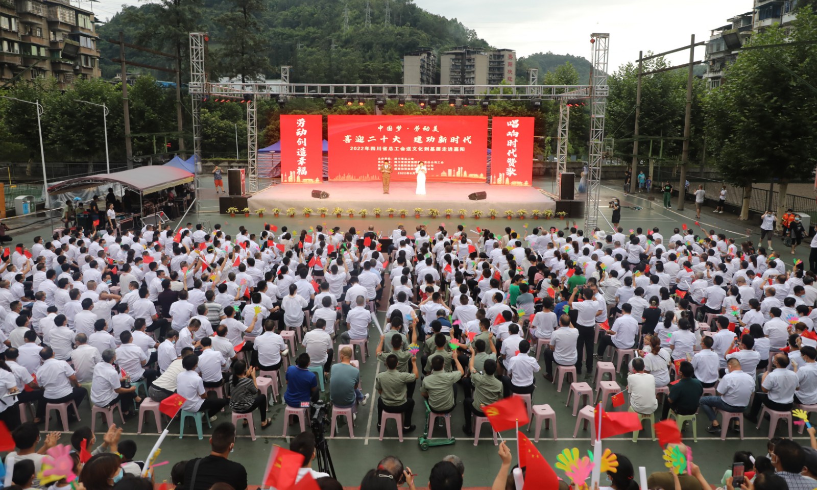 骤雨停歇,晚霞如画。6月23日晚上7点半,2022年四川省总工会送文化下基层“中国梦 劳动美——喜迎二十大建功新时代”走进嘉阳文艺晚会在矿区官斗山体育场举行,为职工家属带来了一场精彩纷呈的文化大餐。